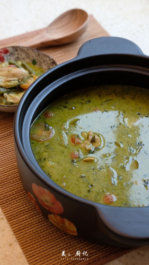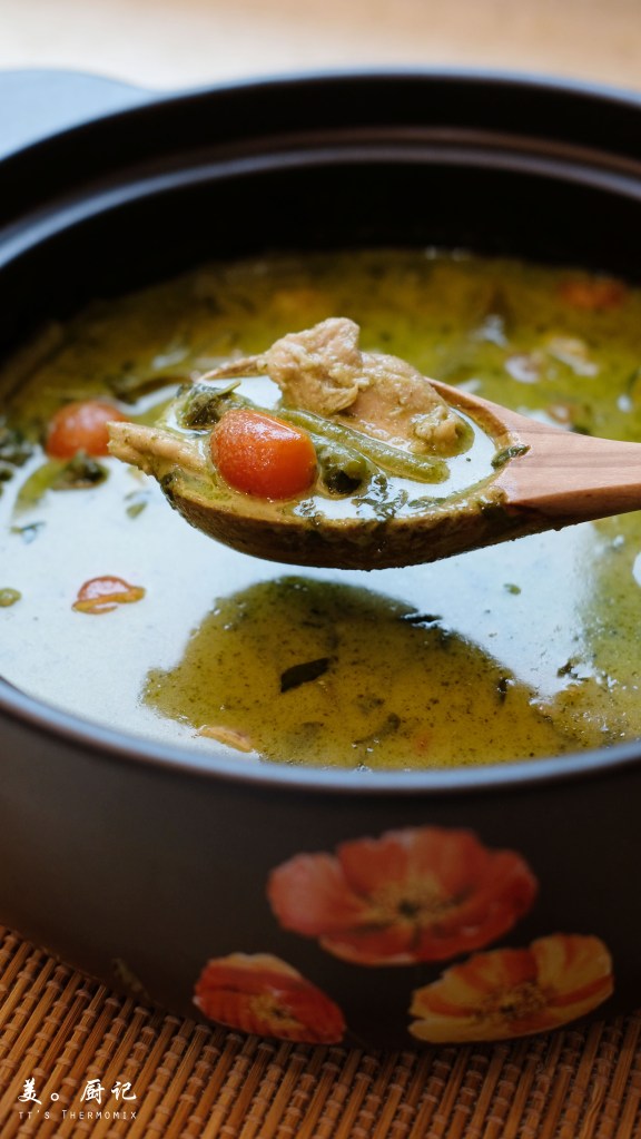 為了這道原汁原味的綠咖喱雞,我在廚房裡待了大半個下午用心烹煮,滿心期待一會兒秉爸吃了能還我一個驚艷肯定的眼神。(^з^)-☆ 短短不到半小時時間,小美便已唱歌了。打開鍋蓋,一股清香的綠咖喱味撲鼻而來。雖然這綠咖喱沒有我預想的濃郁,不過滿滿的盡是天然辛香料清爽獨特的香氣,光喝一口便讓人精神抖擻很是開胃啊~(^◯^)不過個人覺得味道是有點鹹,於是我另外添加了糖的部分,把那鹹度稍微調和一些。再說,一大鍋的咖哩就只加了區區四根的綠色指天椒,那個辣味根本就是微乎其微,完全沒有讓人吃了大汗淋漓又愛又恨的痛快感。╮( ̄▽ ̄"")╭