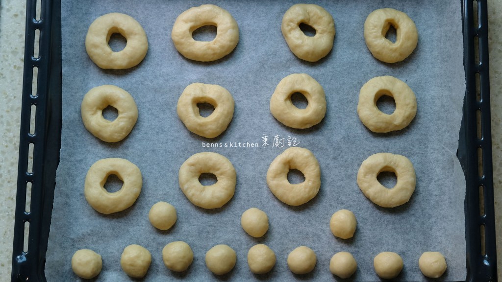 - 將中間切割出來的小麵團揉成球狀,與切割好的甜甜圈麵團一併移至舖了烘培紙的烤模上,進行最後發酵30~40分鐘至兩倍大。