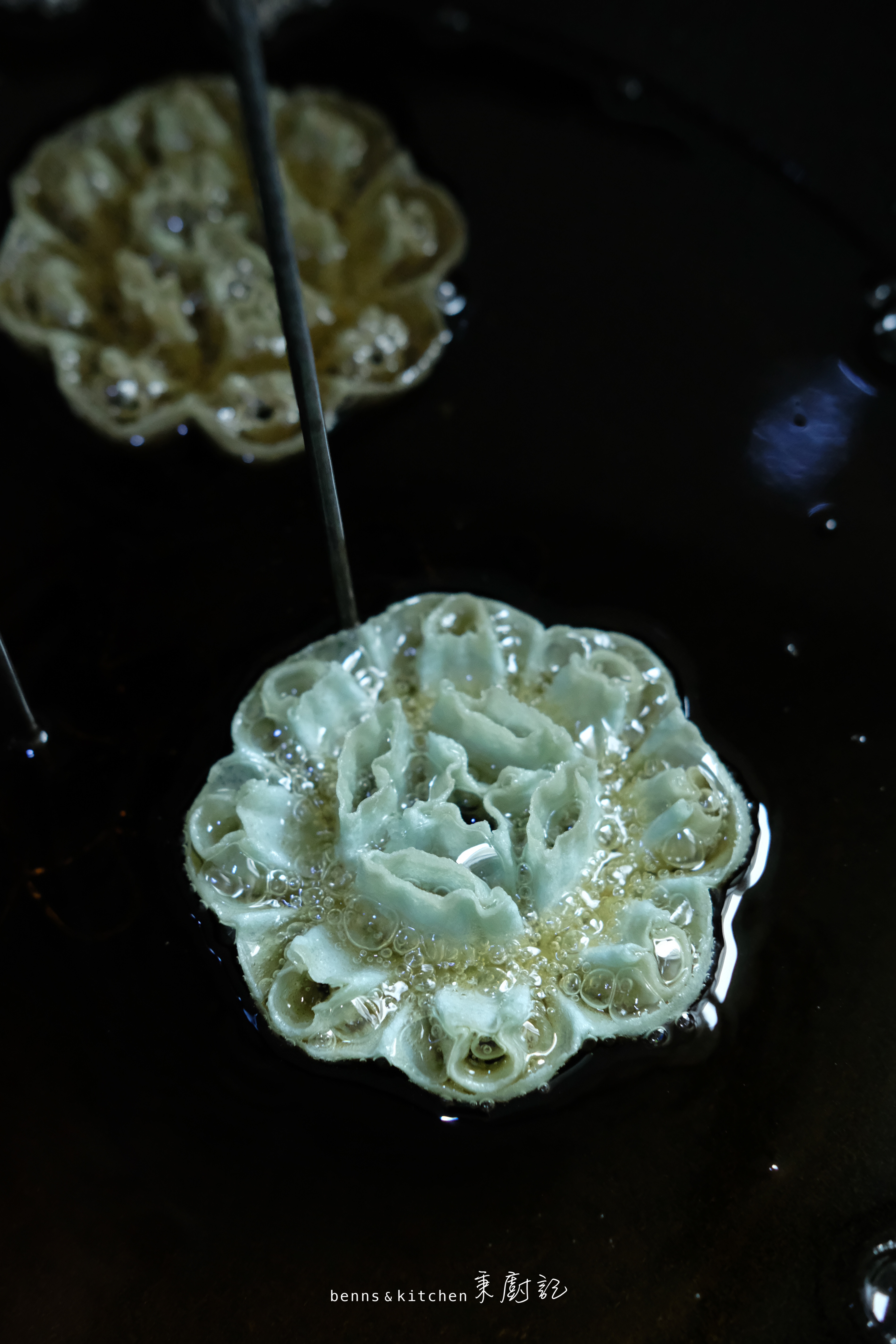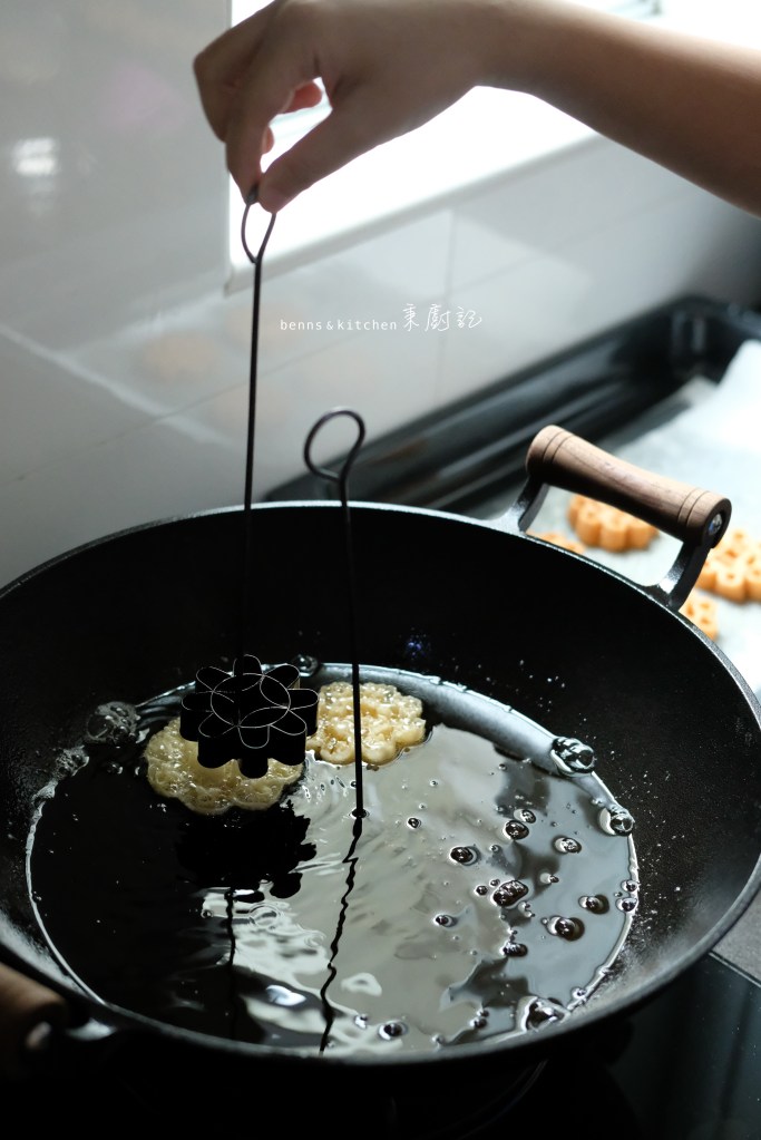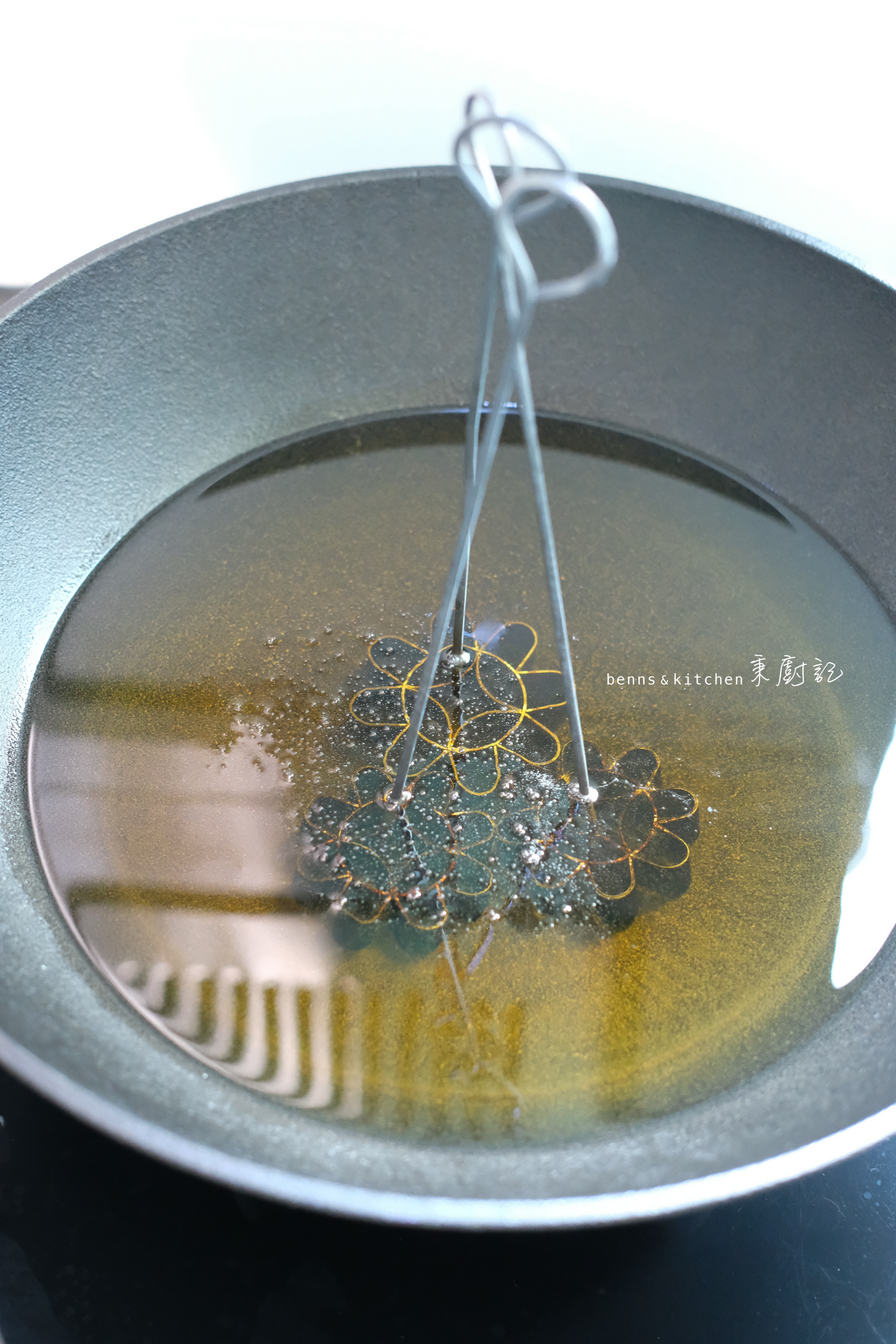 - 將作法6的模具泡入油鍋裡,別讓麵糊碰到鍋底以免上色太快。約10秒後將模具提起,這時餅皮會順勢脫模而滑落油鍋裡。將模具放回油鍋裡重新加熱。