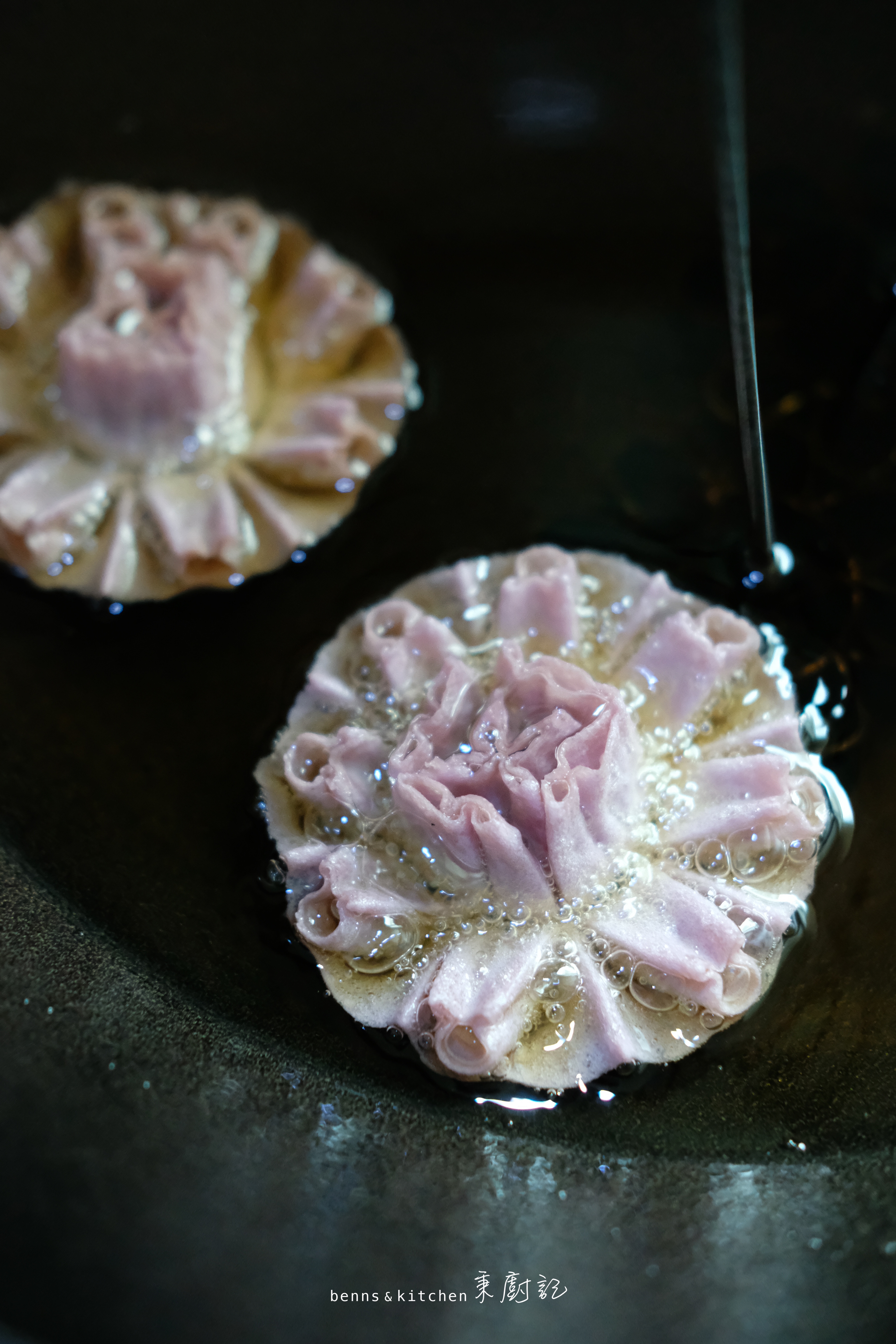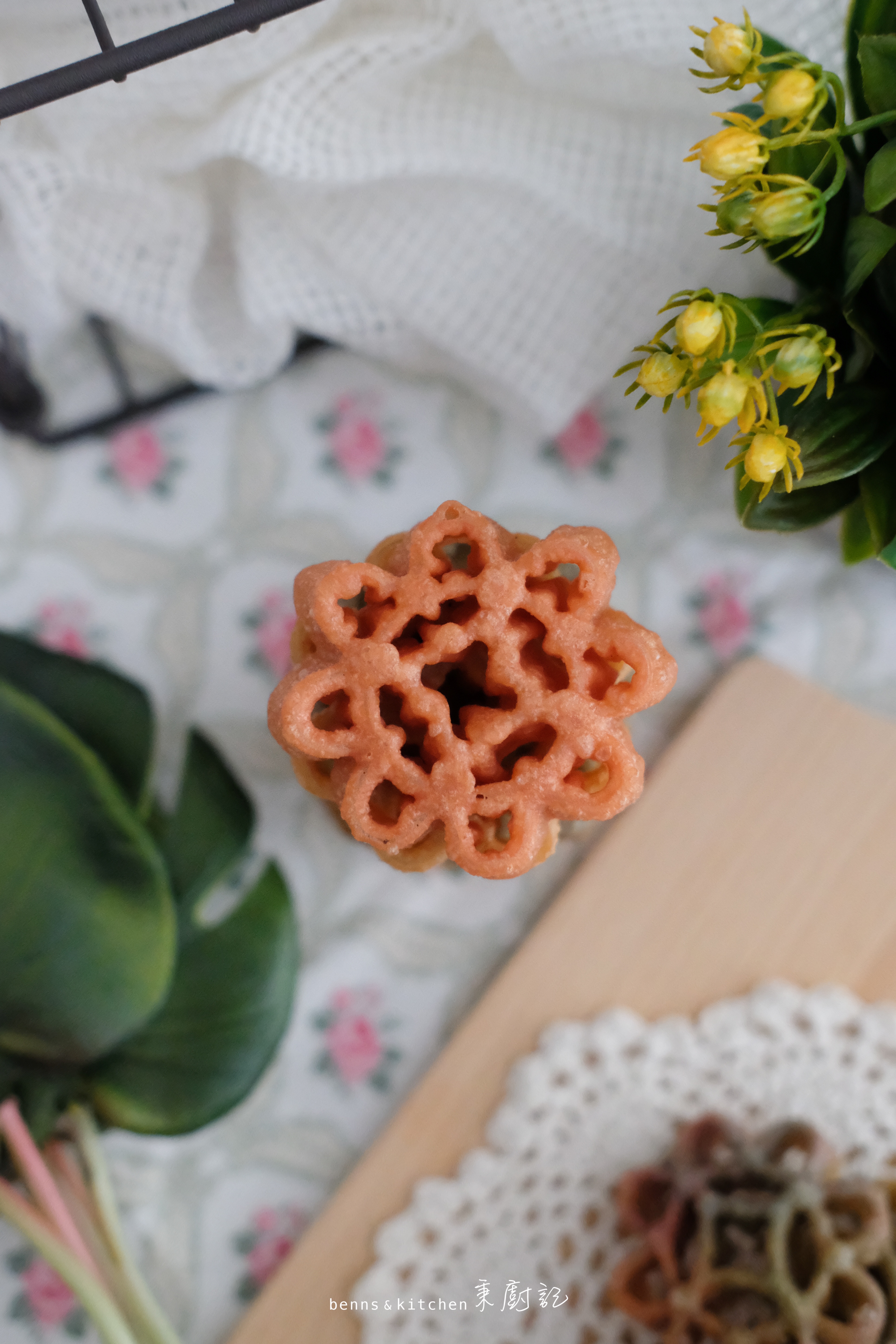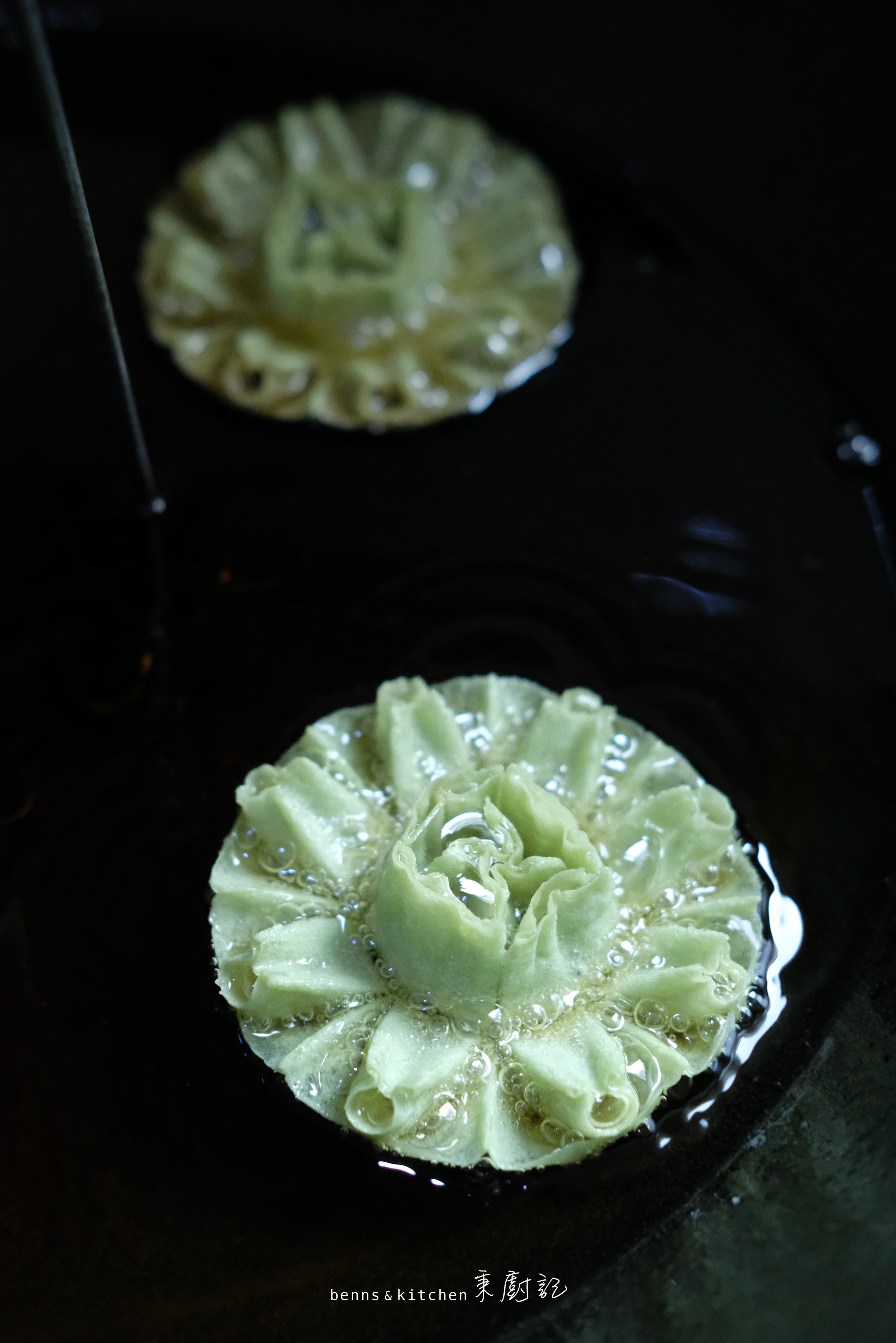 - 將作法6的模具泡入油鍋裡,別讓麵糊碰到鍋底以免上色太快。約10秒後將模具提起,這時餅皮會順勢脫模而滑落油鍋裡。將模具放回油鍋裡重新加熱。