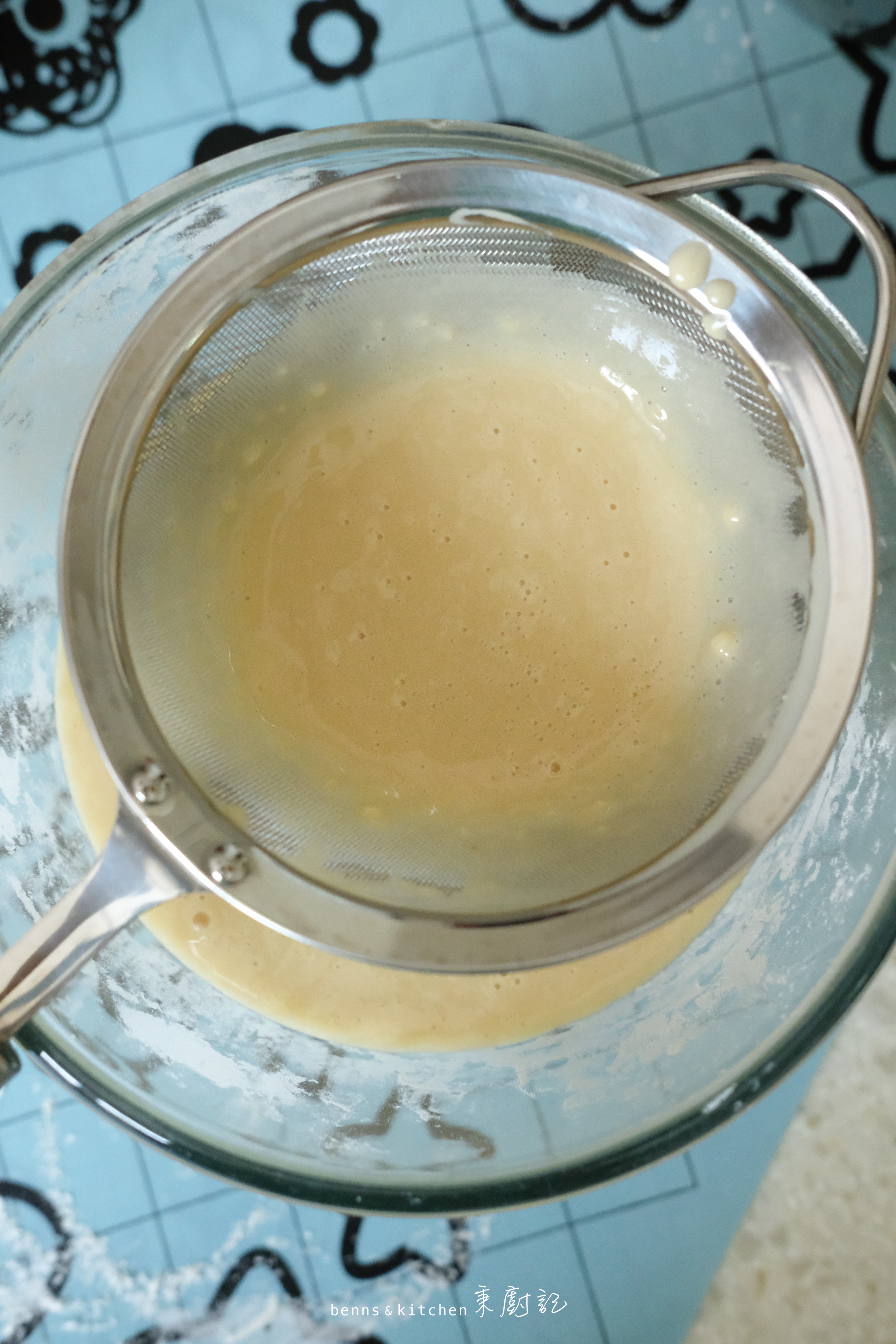 - 將麵糊過篩至無粉顆粒,室溫下靜置15分鐘待用。