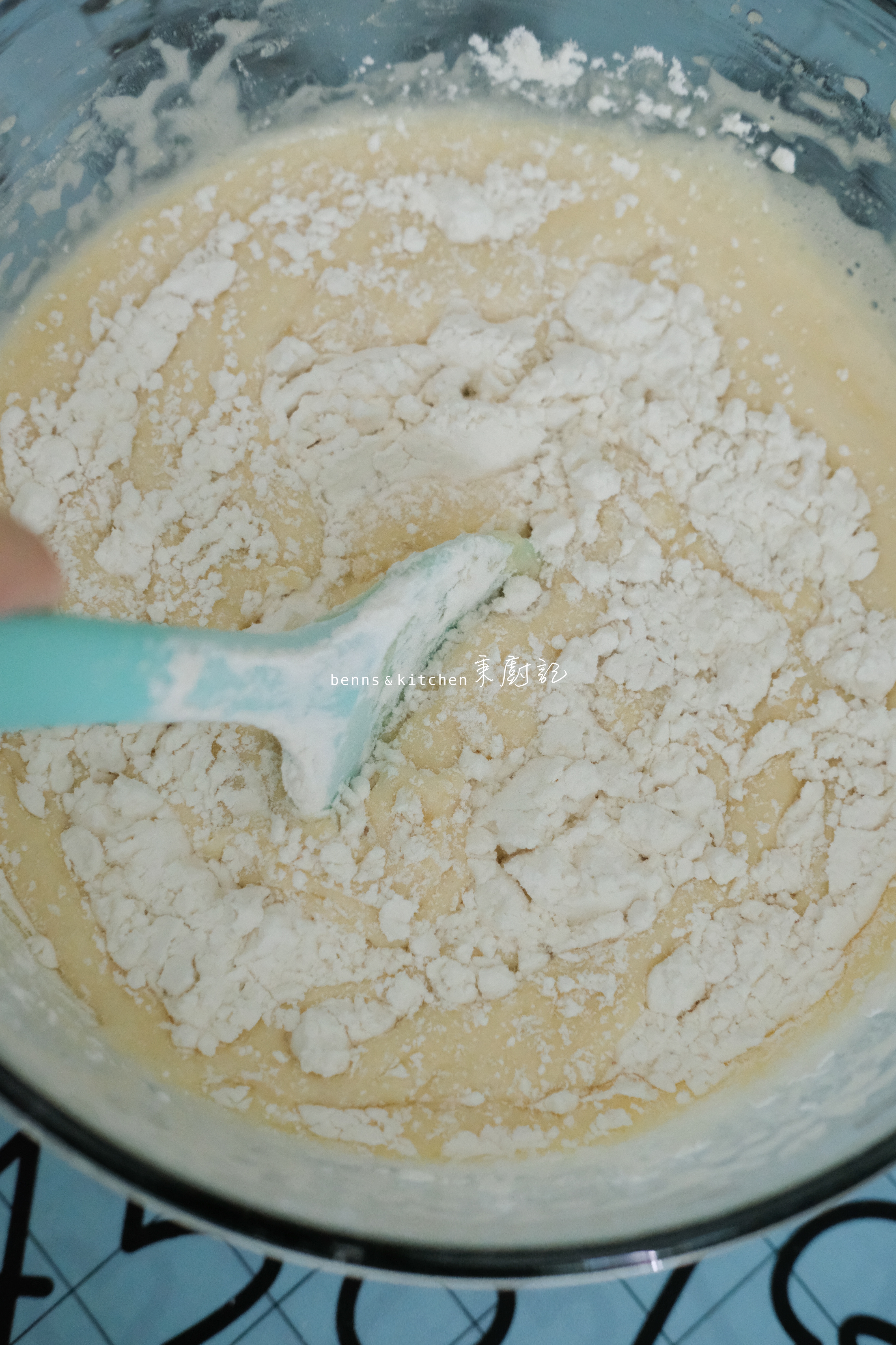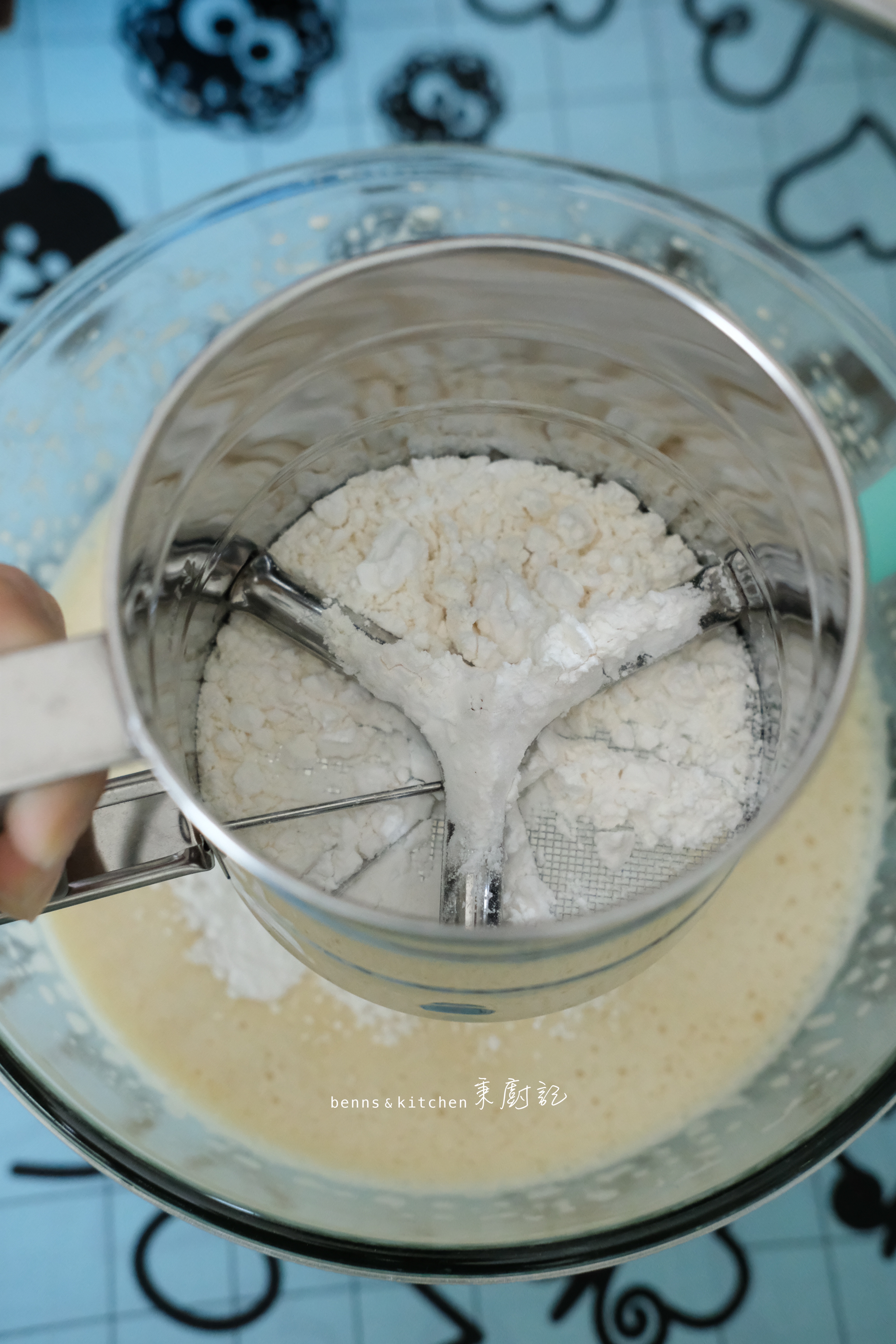 - 將所有粉類分次過篩至攪拌碗裡,跟著用刮刀棒以切拌方式拌勻。