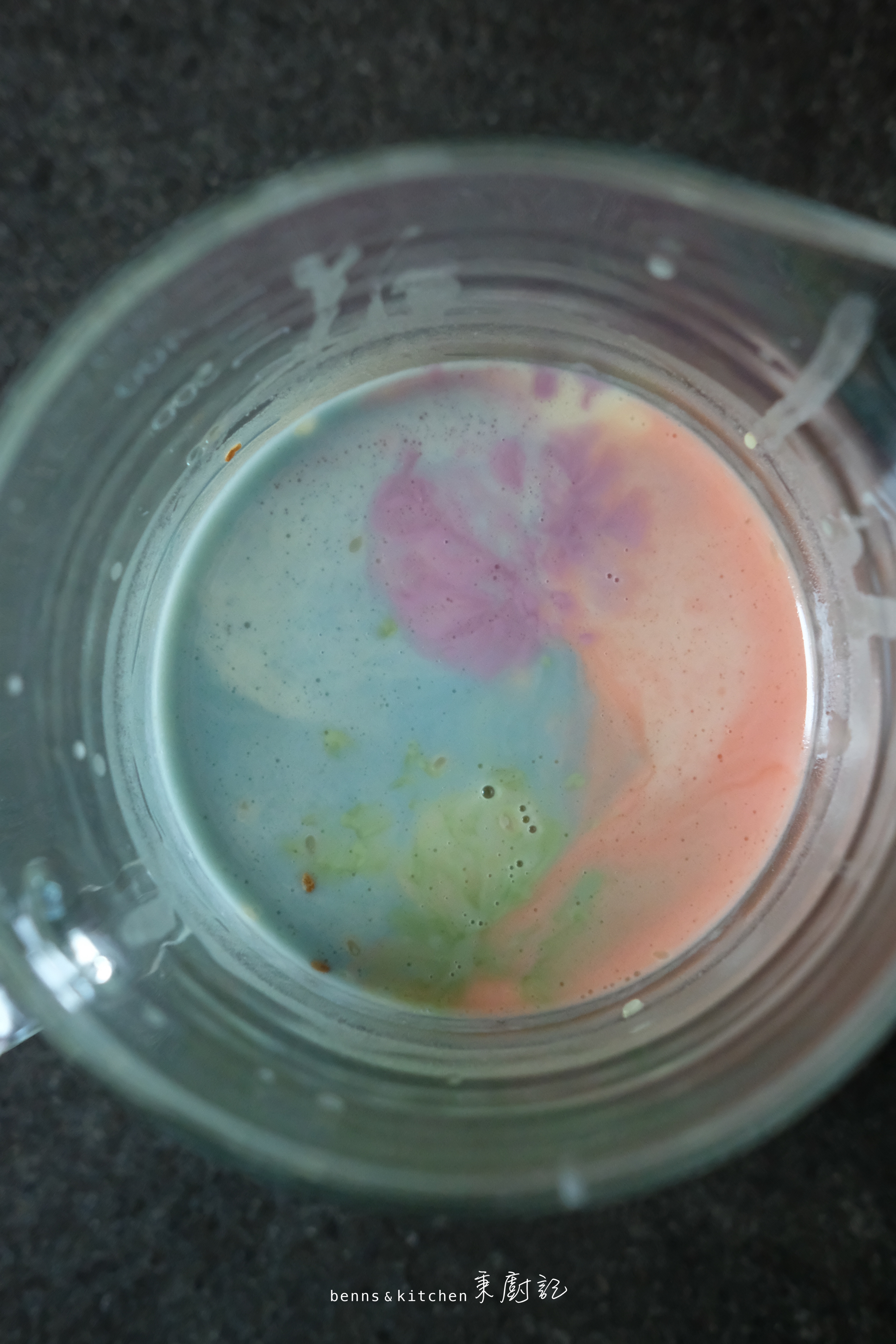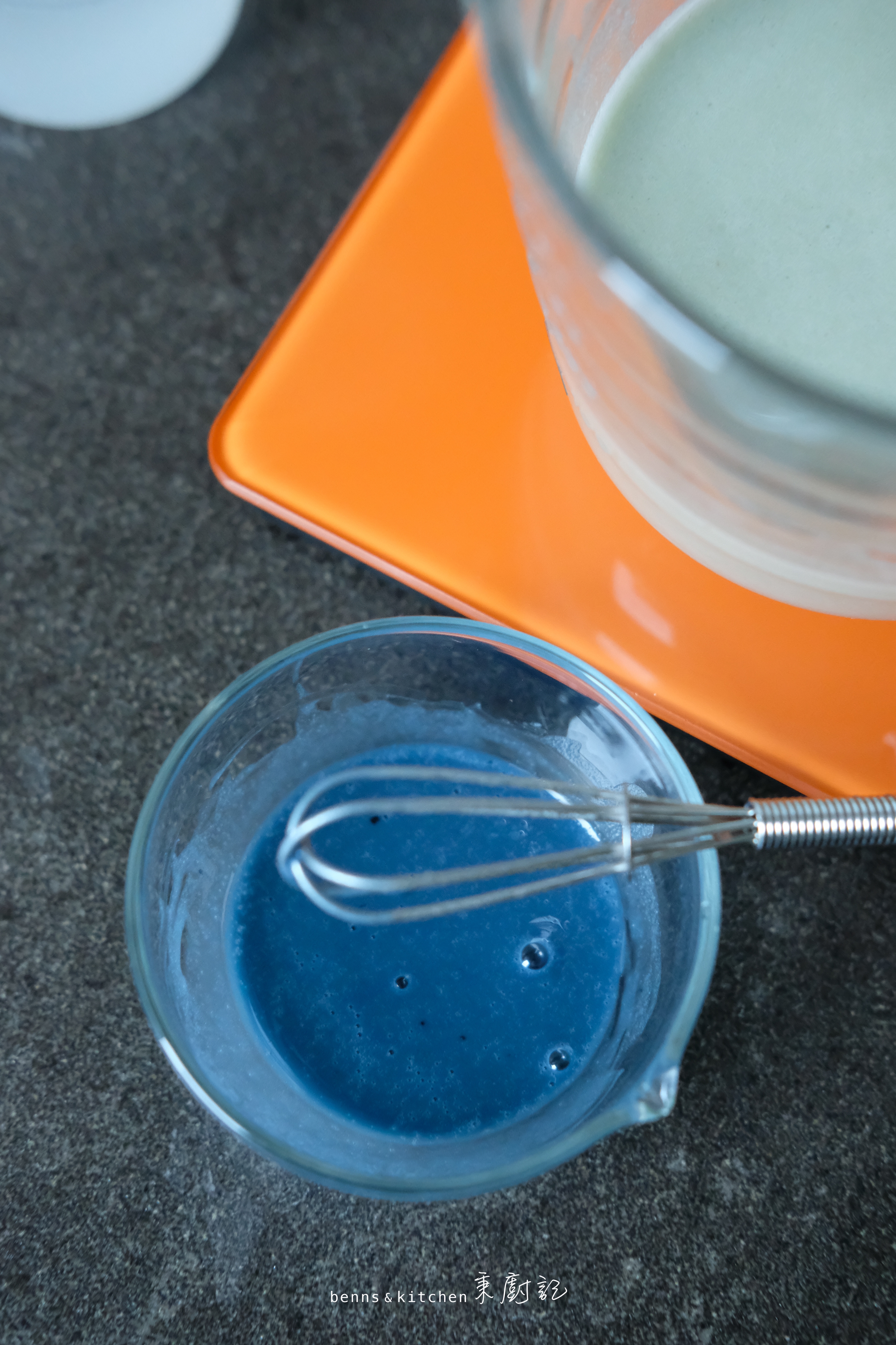 - 將色漿倒回作法1的麵糊裡,拌勻後即可開始後續製作。