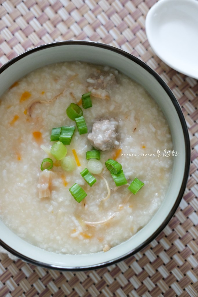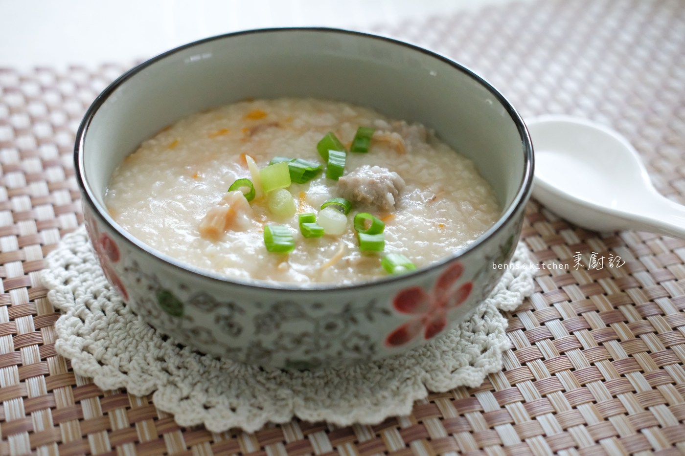 煮粥,我喜歡先加點油爆香辛香料,跟著加入魷魚絲干貝等海鮮乾貨與生米一塊兒炒一炒,最後才倒入熱水慢速熬煮。待米粒開花,即可加入肉糜丸與蘿蔔絲等材料煮個十分鐘。就這樣,熱騰騰香噴噴的鮮味肉糜粥就出锅咯!
