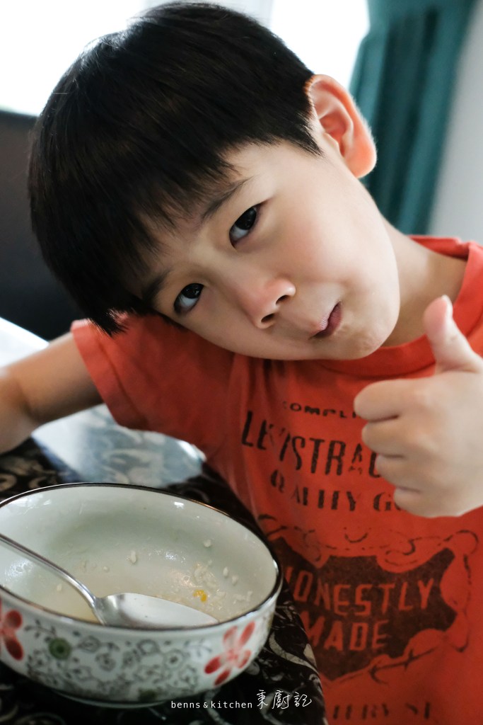 悻悻然地吃了兩小口,迷秉突然意識到粥的美味,跟著一口接一口吃得津津有味,最後還給媽咪豎起了愛的大拇指以表示支持。╭(╯ε╰)╮