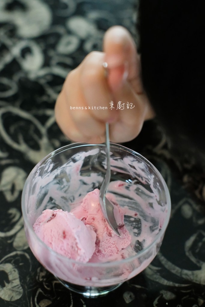 迷秉跟著低著頭,一勺接一勺,慢條斯理地享受著他單一的草莓雪糕球。
