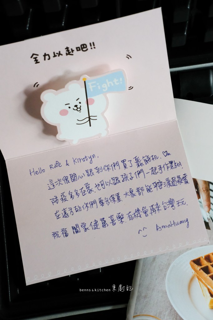 謝謝妳,Anna。雖說超市離妳家很近,但要妳來回奔走真的很不好意思。收到包裹的那一刻,心情是激動的。謝謝妳還那麼貼心地在包裹裡塞滿了防震泡泡膜,另外還給我們寫了張海藍色小卡片。期待來日我們有相見的一天,還得向妳請教鯛魚燒的作法呢~😁