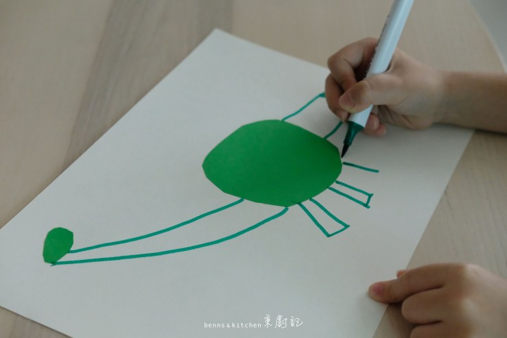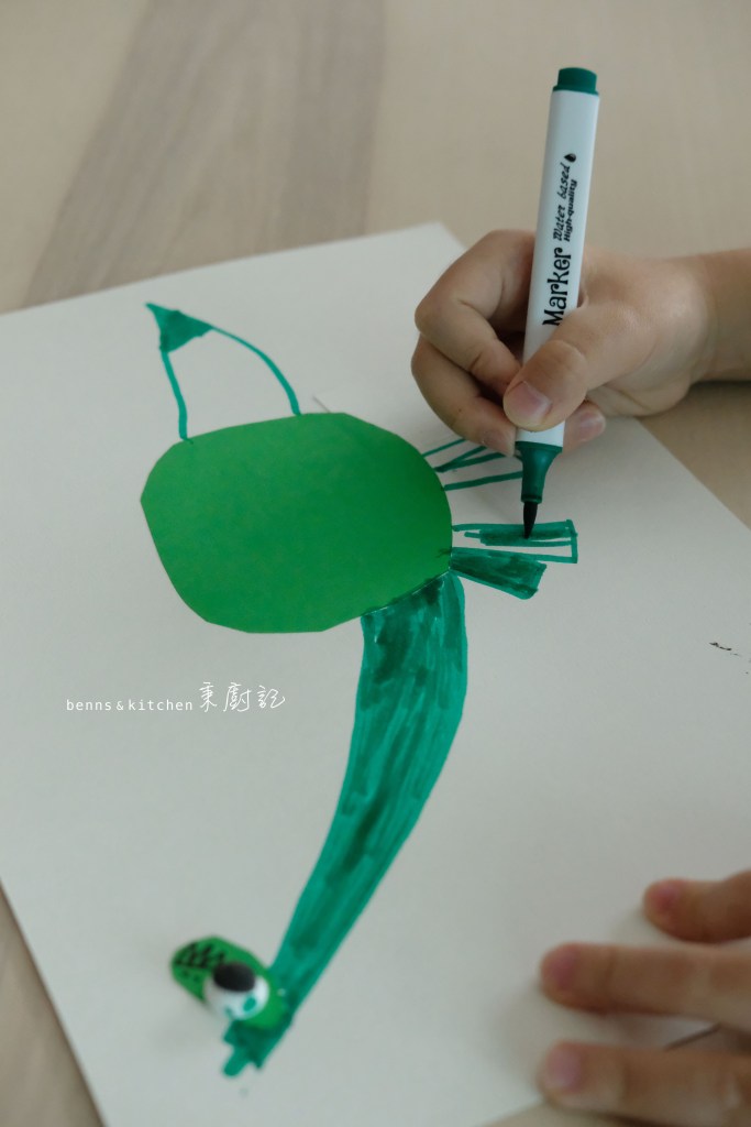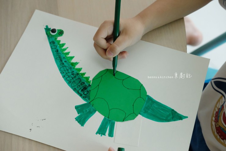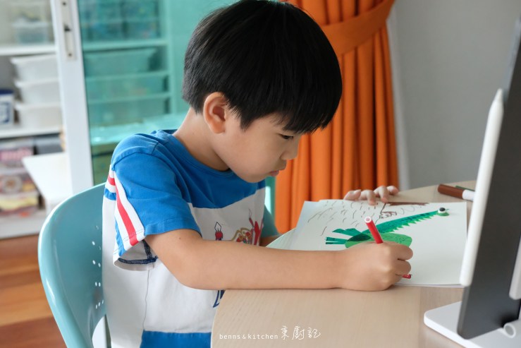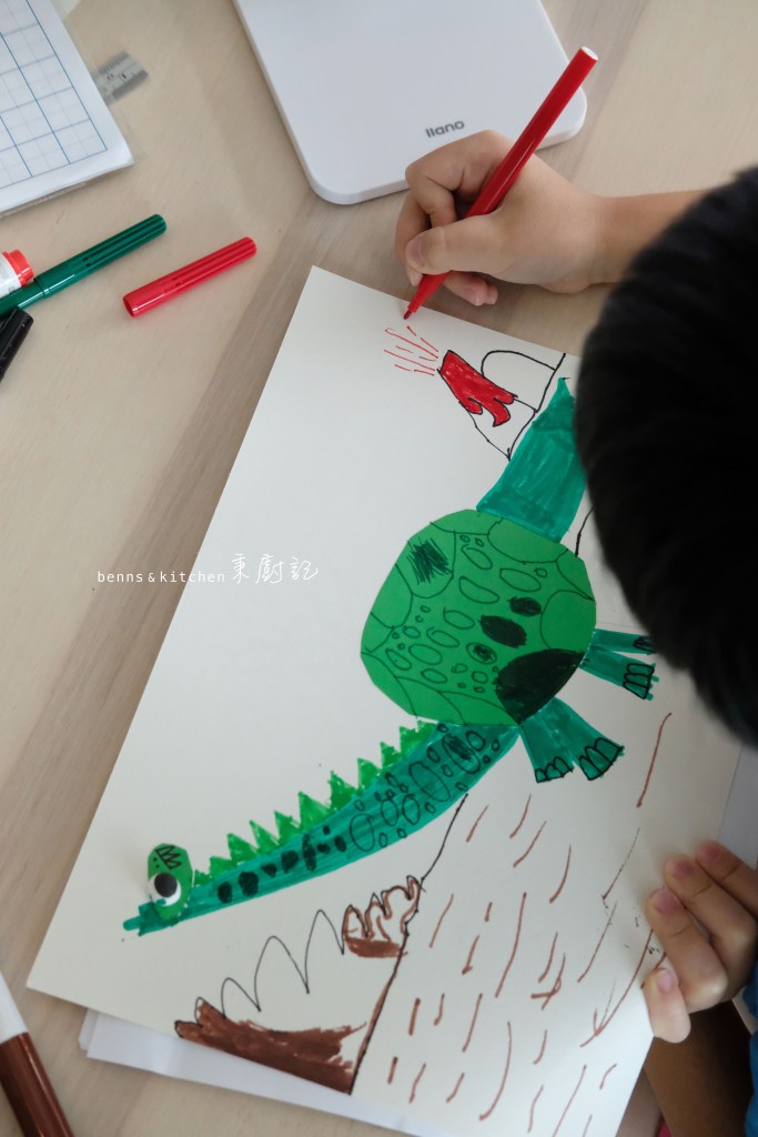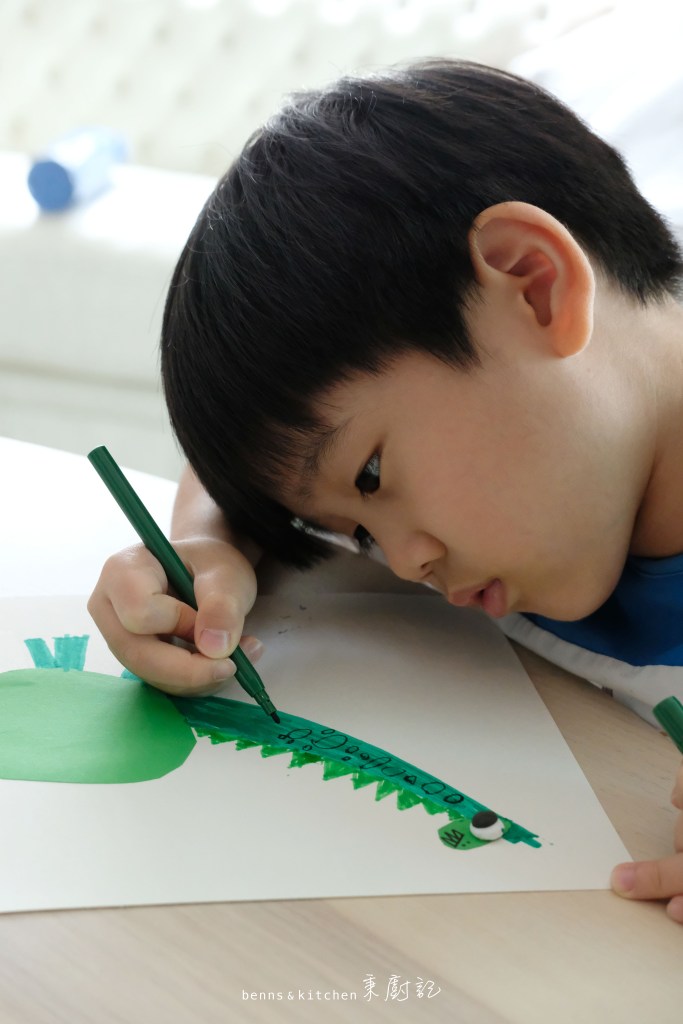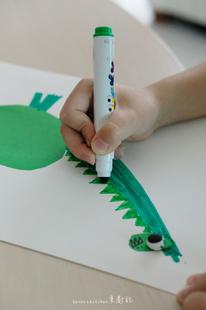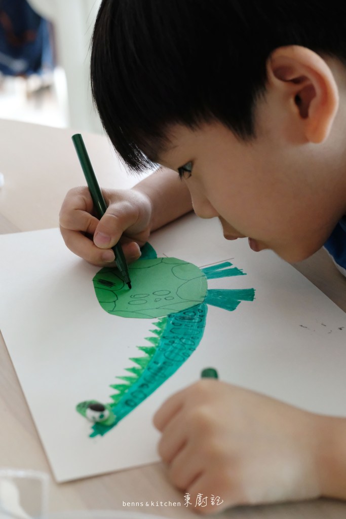 不過這節課的內容挺豐富的,除了一般的馬克筆繪畫以外,還設計了運用剪刀膠棒與輕黏土的環節,讓孩子們可以體驗一下手工的樂趣。這一點,迷秉很是喜歡,全程表現也是比較投入專注的。