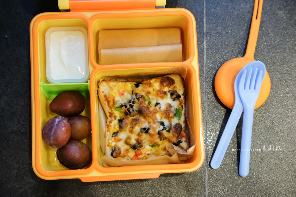 今天的早餐盒,有媽咪的愛心吐司披薩和一小盒杏桃優格。水果方面,有小秉最愛的青蘋果,和迷秉最愛的蜜梅枣。