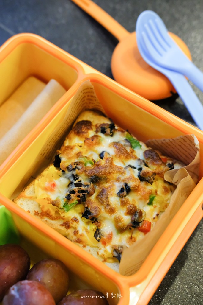 迷秉今天起得早,一直在媽咪身邊瞎轉。看見我給哥哥製作的吐司披薩,小傢伙瞇著眼開心地說,「耶~好久沒吃披薩了~」呵呵,就知道你愛吃,記得給我清盤吃光光回來哦~