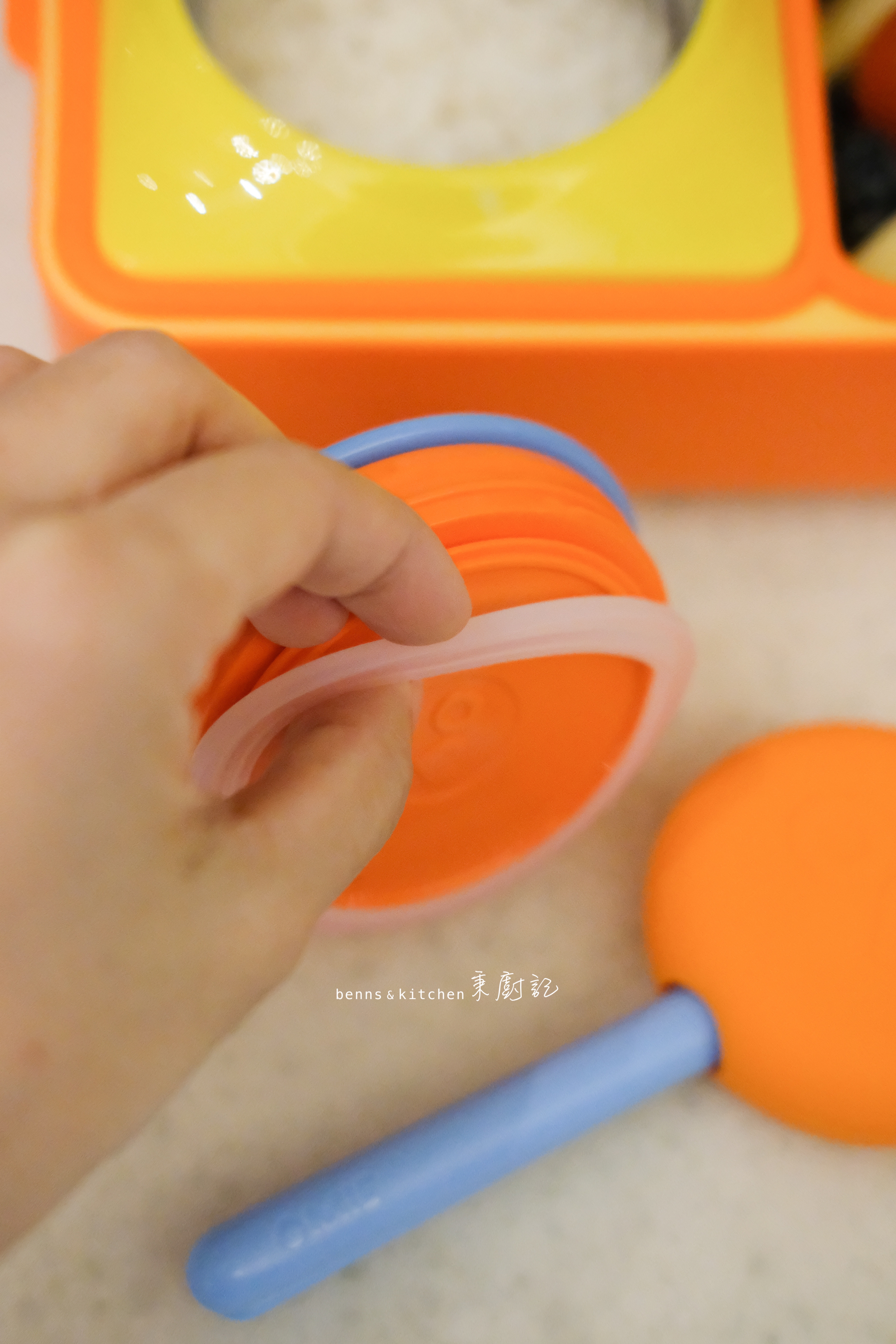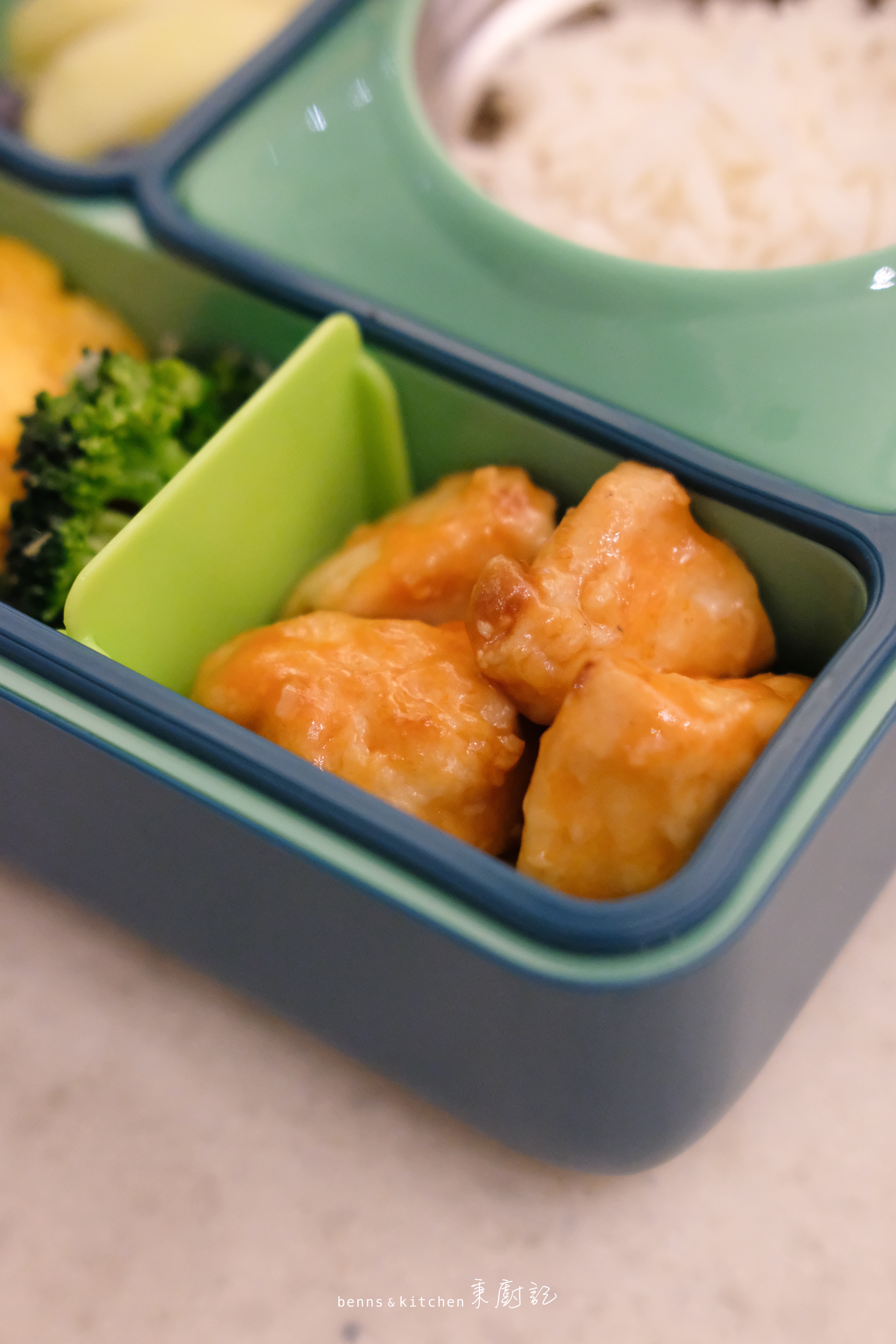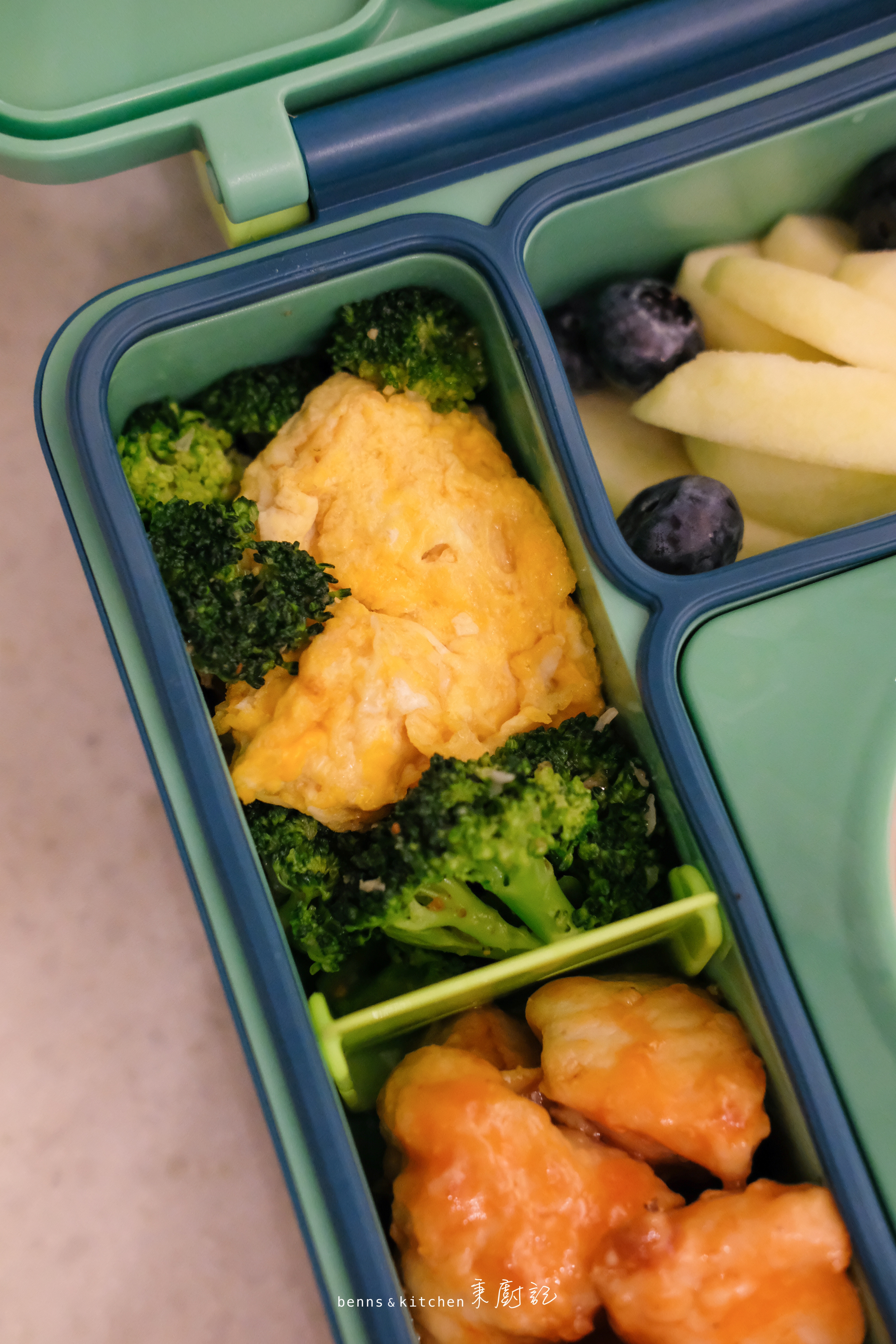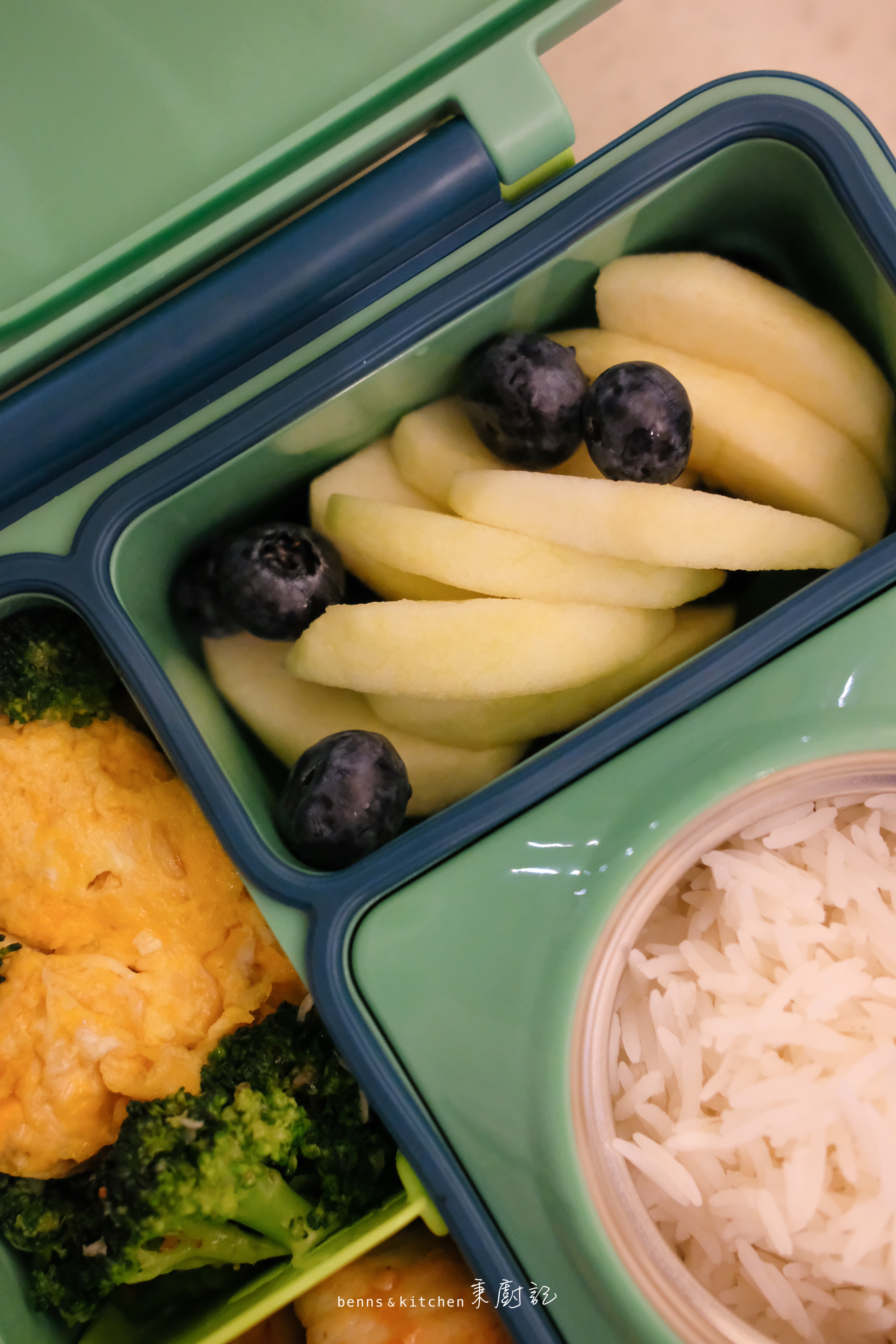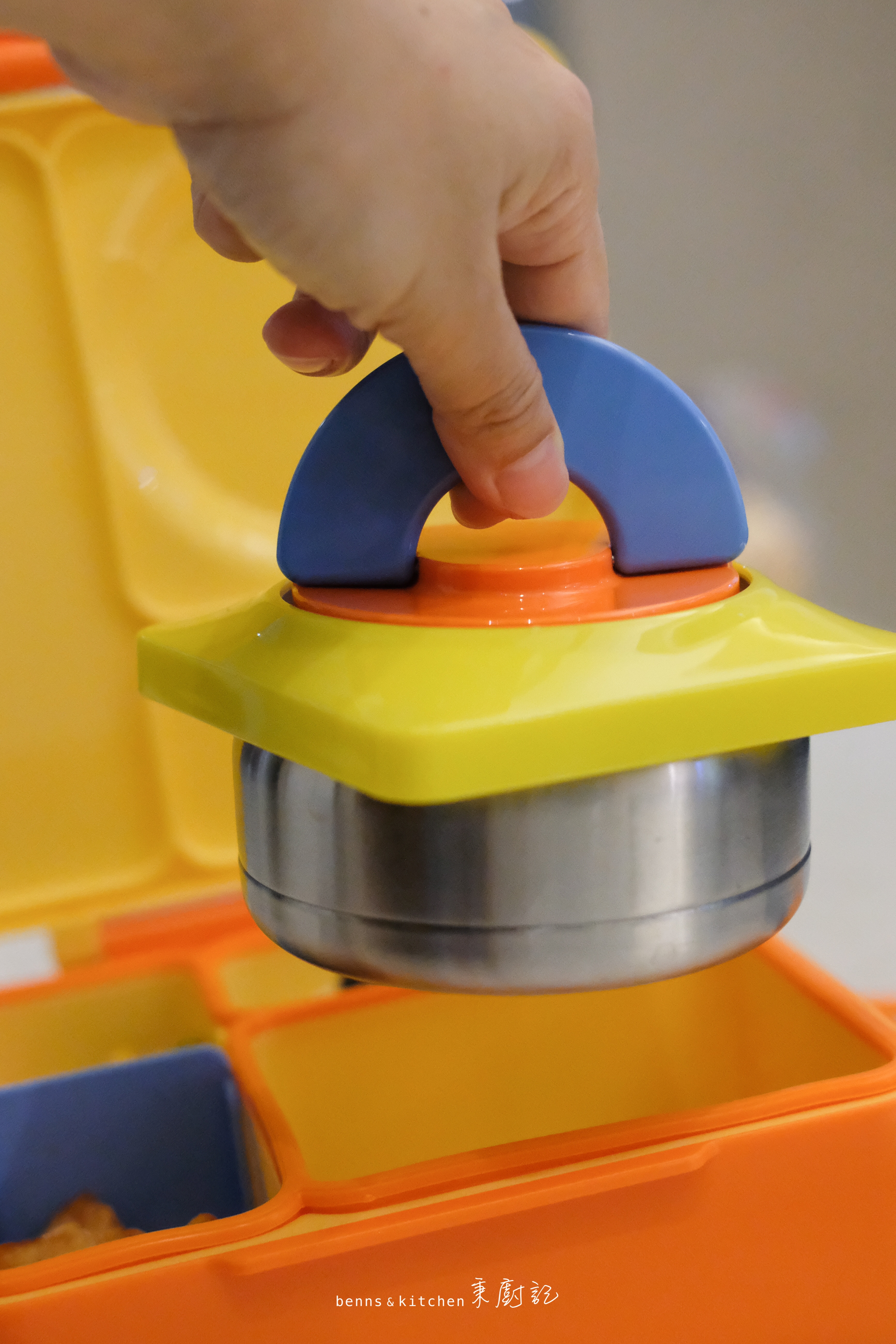 至於迷秉的餐盒,則比哥哥的來得少一些,輕一些。重點是他不用自己背,都是爸爸連同書包直接交到老師的手上。