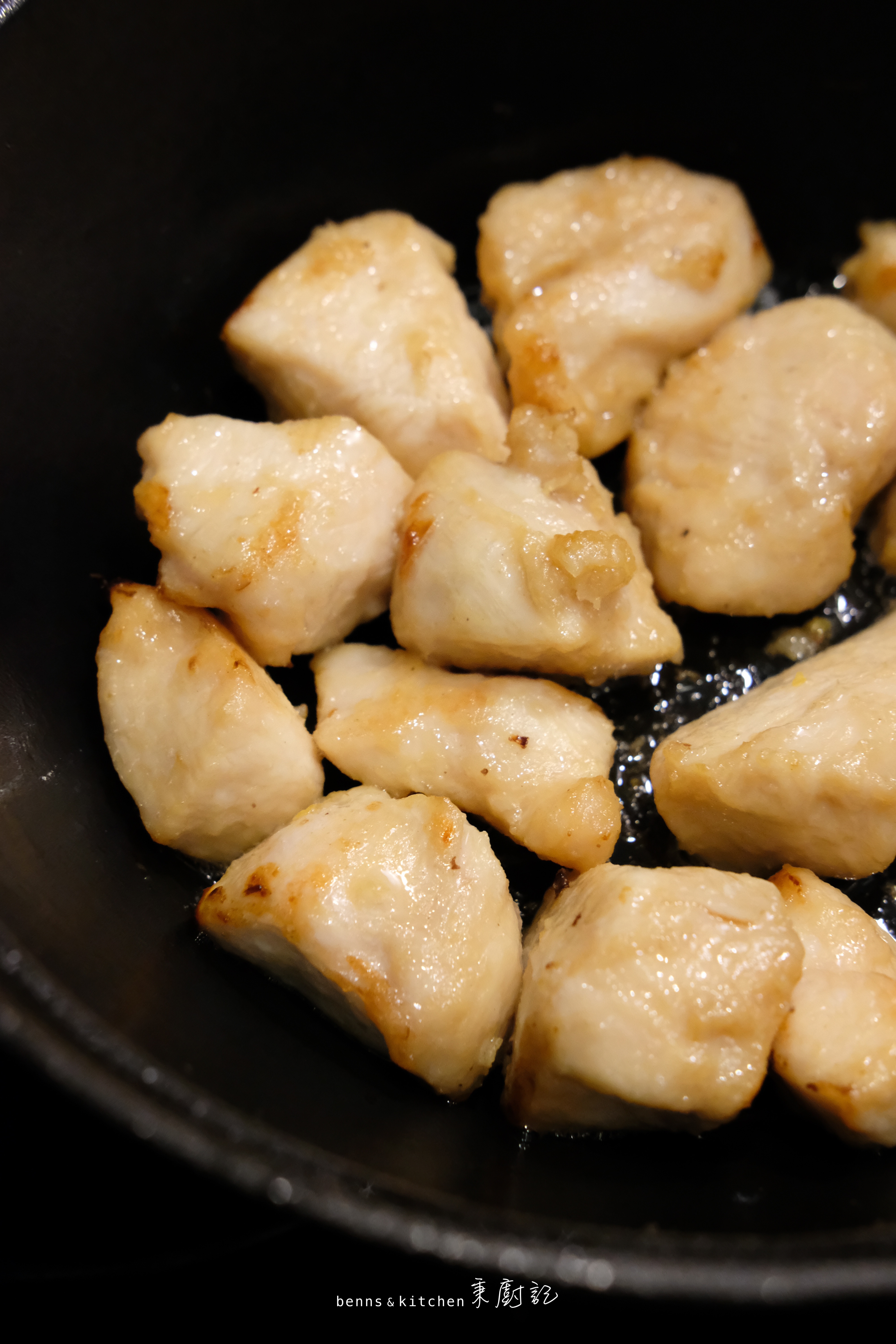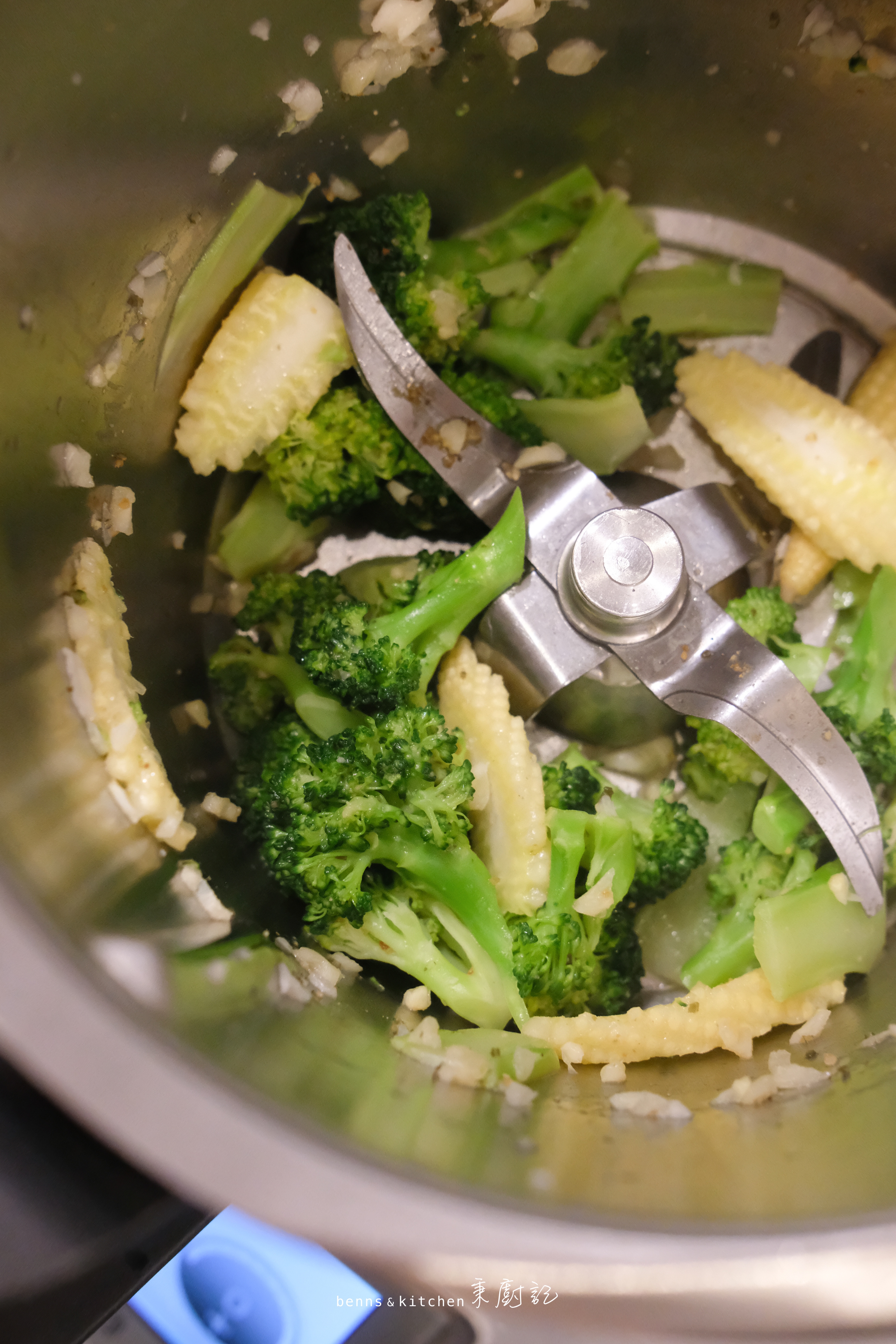 氣炸雞肉的同時,米飯也煮好了,可以開始炒菜咯~ 先是爆香蒜米3分鐘,跟著清炒玉米筍西蘭花3分鐘。過程中只需加三小勺煮飯後預留的米湯、一小勺自制鮮味粉、以及少許鹽調味即可。