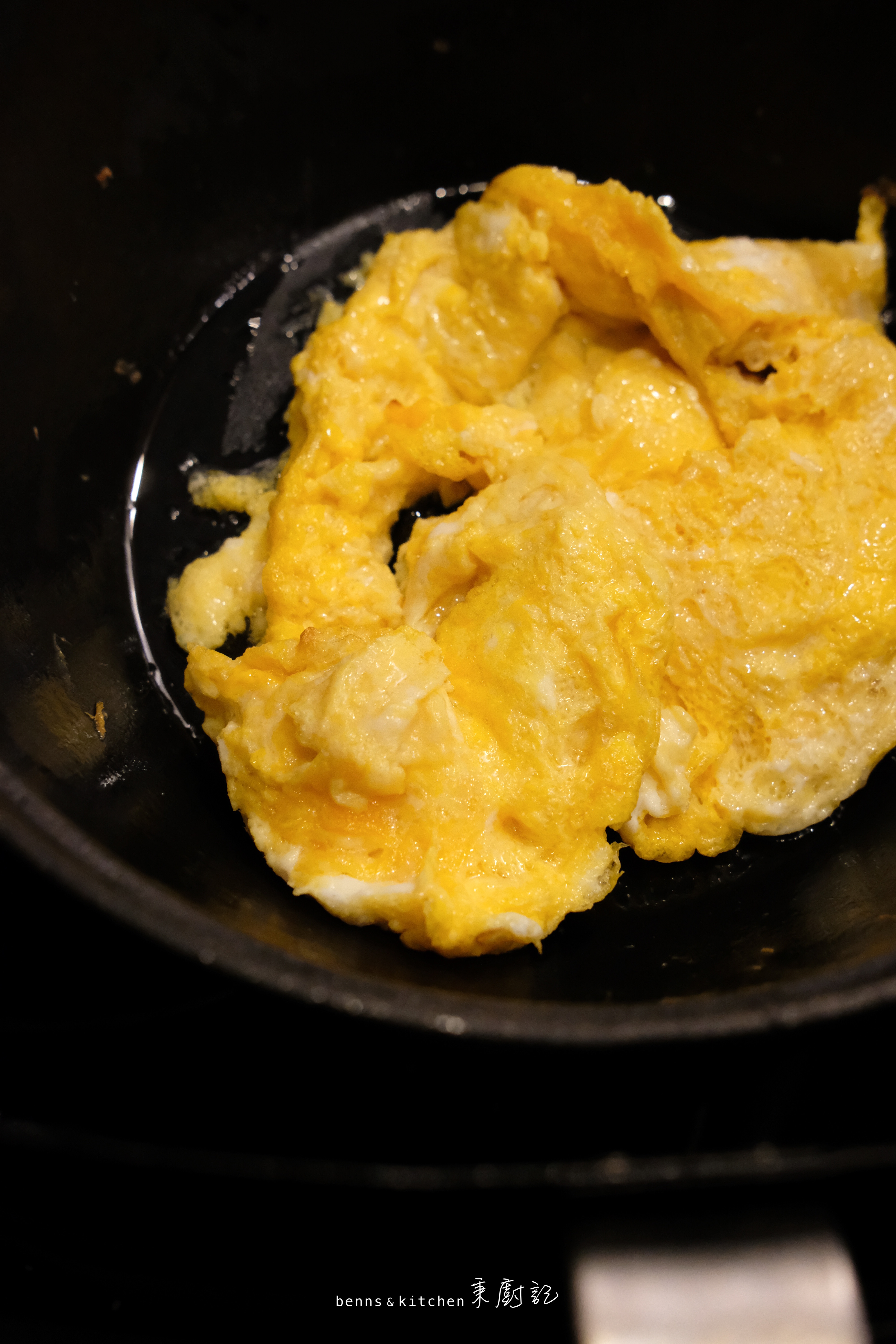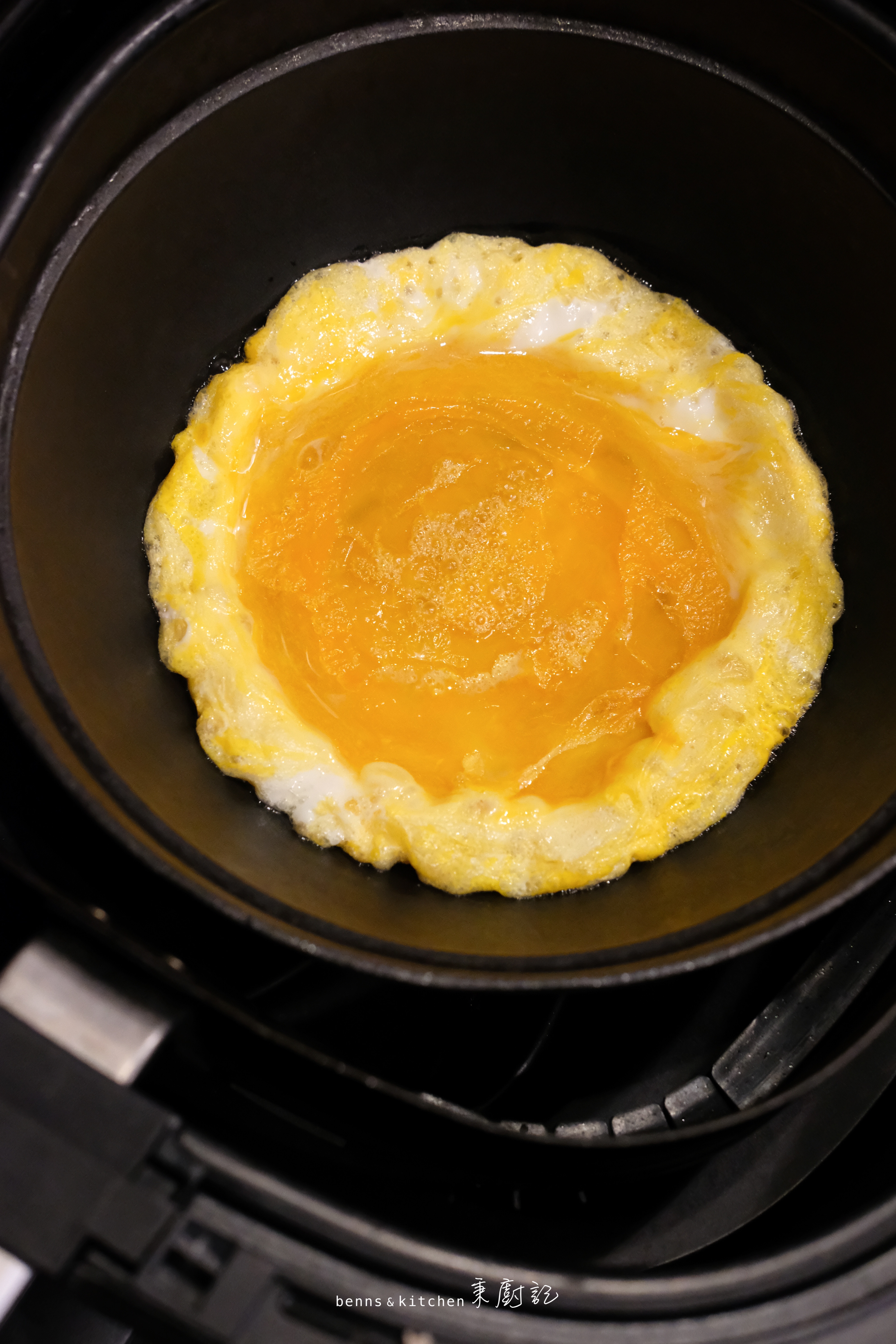 這頭鑄鐵鍋預熱好,加油加蛋液以200度氣炸3分鐘,每一分鐘開鍋翻拌一次,快速簡易的氣炸鑄鐵炒蛋就完成咯~