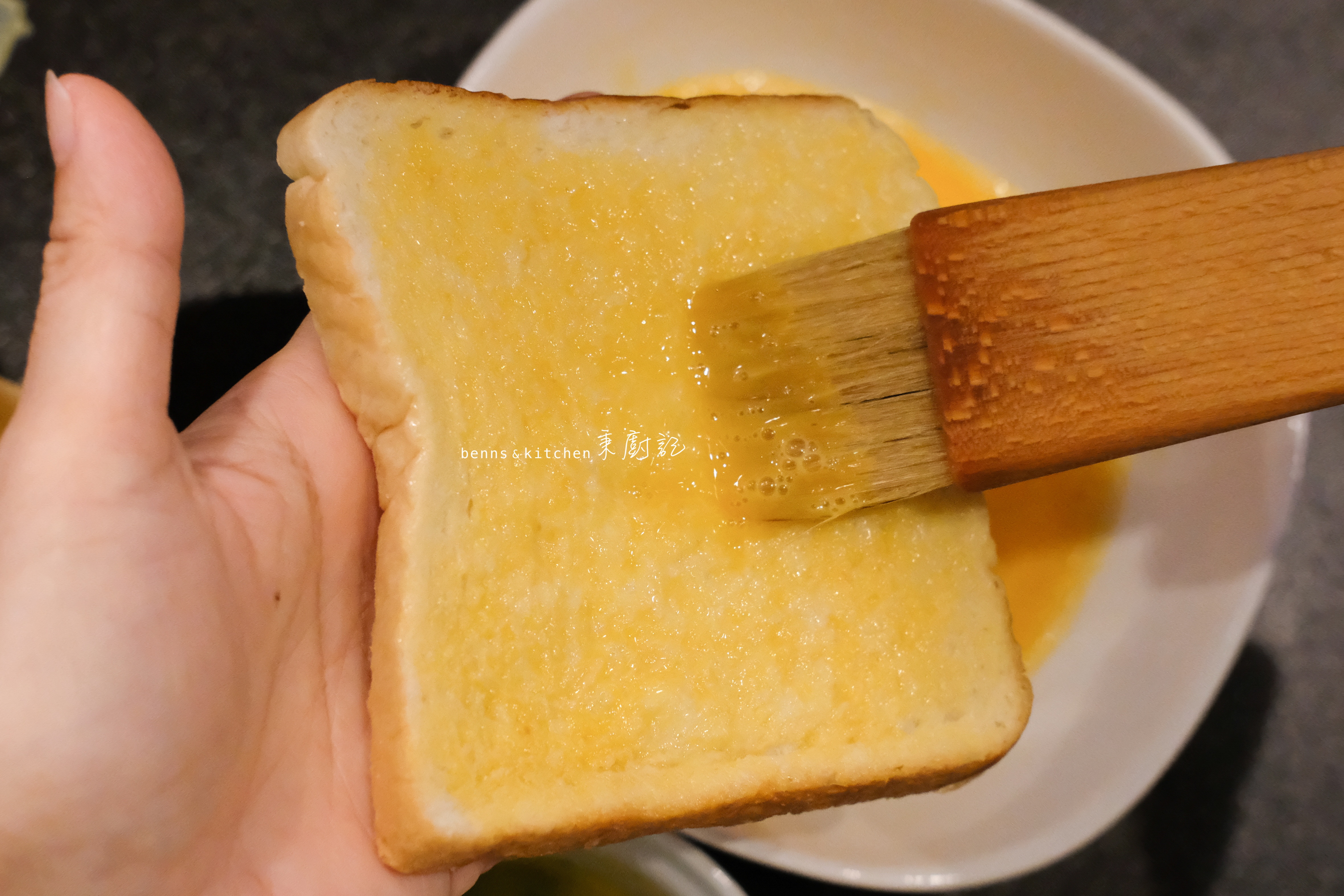 - 吐司表面抹上一層蛋液,平均擺上9小塊切片香蕉,跟著抹上一層作法1的香蒜奶油,最後在表面上平均撒上一小撮蔗糖。