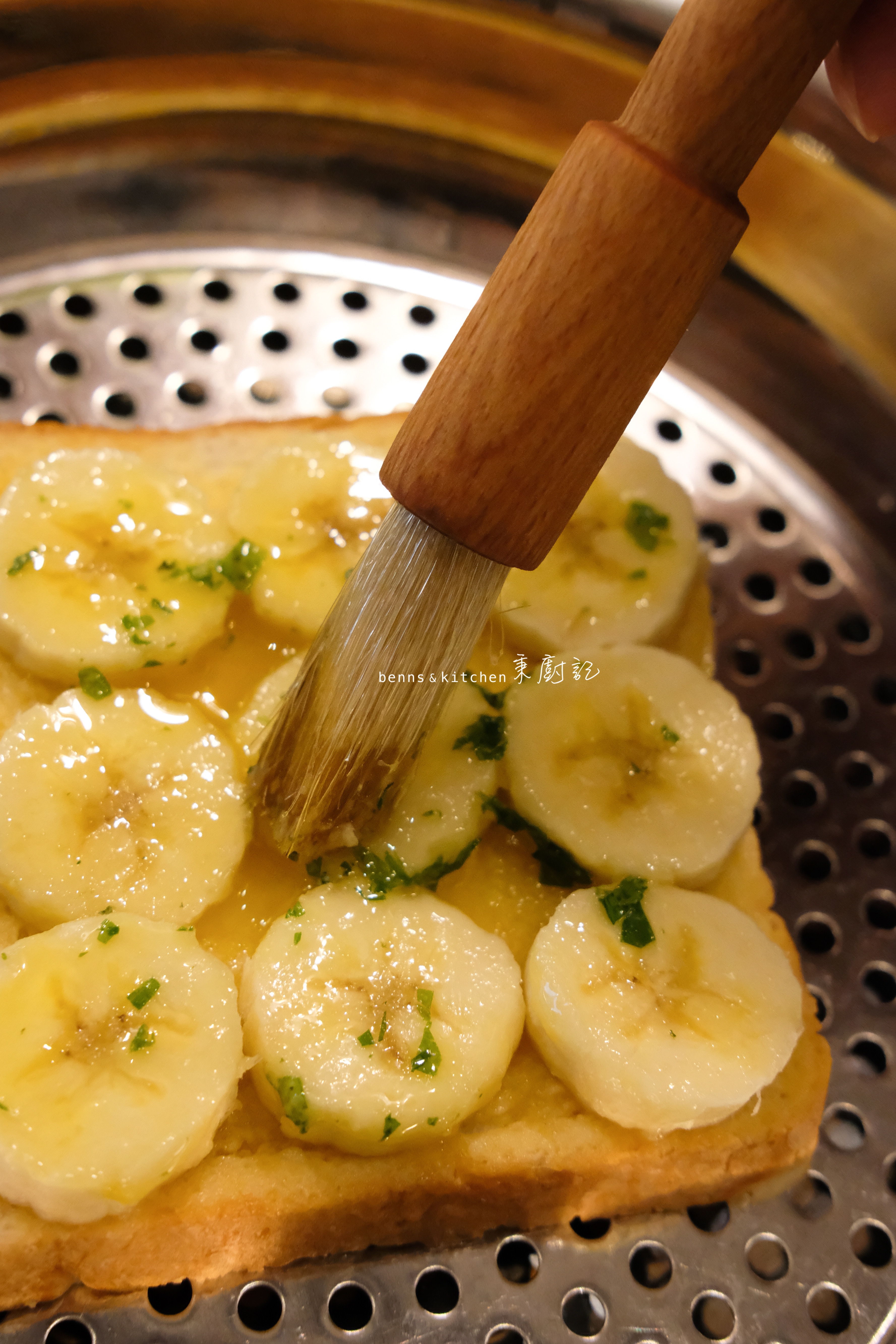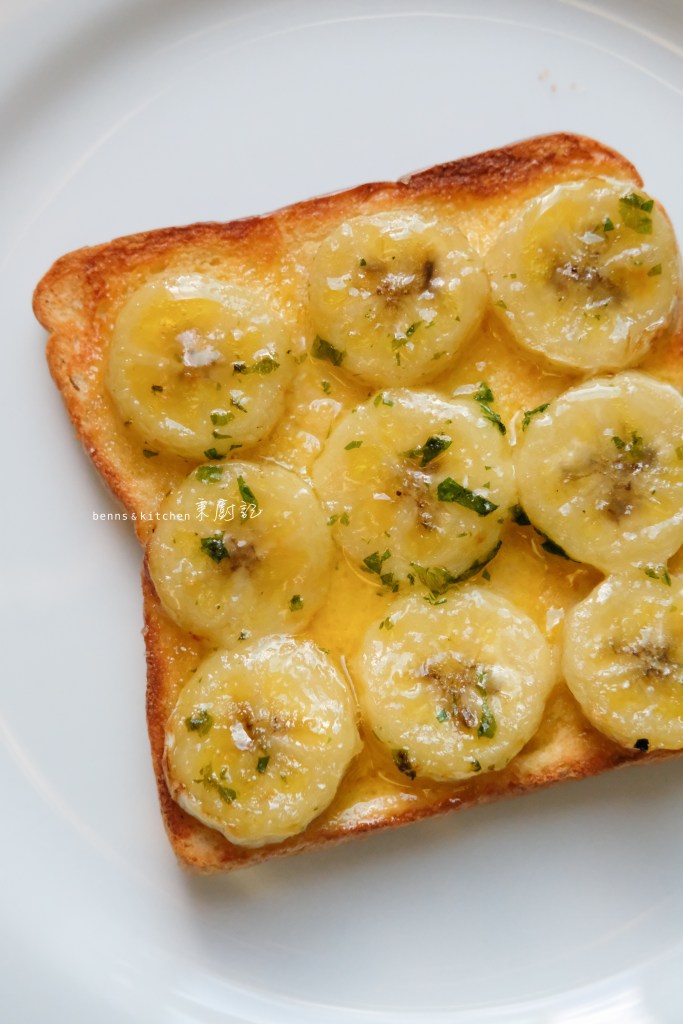 看了一下食譜,跟我以往製作過的簡易版香蕉烤吐司有點不一樣。吐司先是抹了一層蛋液,再放上切片香蕉,最後再抹上一層融化奶油加砂糖烤製。我另外在奶油裡加了些新鮮歐芹和自制蒜粉,感覺整個就是昇華版的香蕉烤吐司。