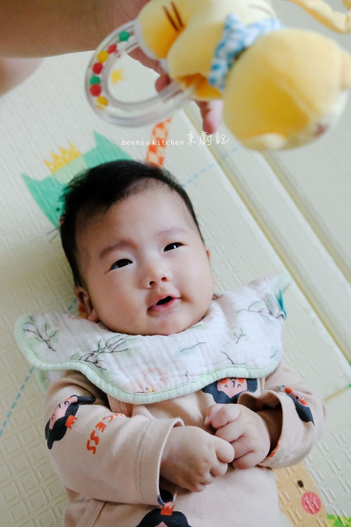 手指的靈活度也隨之明顯進步了。她開始懂得抓住媽咪塞在她手掌心裡的安撫娃娃,不是攢緊一陣拉扯,便是一把塞進嘴裡死啃。嗯,是時候給她買個磨牙器了。
