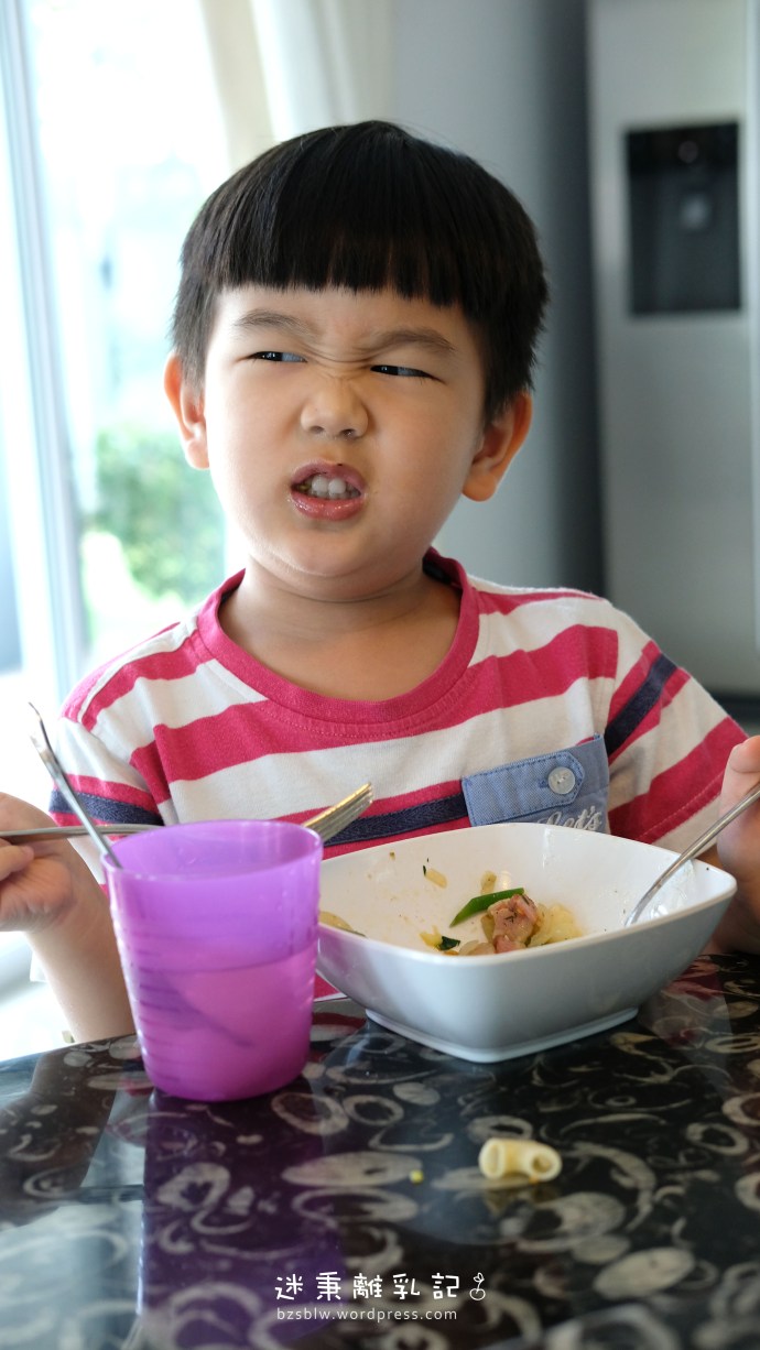 晚餐,媽咪煮了親子丼給大夥兒吃。 吃著吃著,迷秉突然停止了咀嚼動作, 一臉困惑地若有所思, 跟著張開口用手指指…