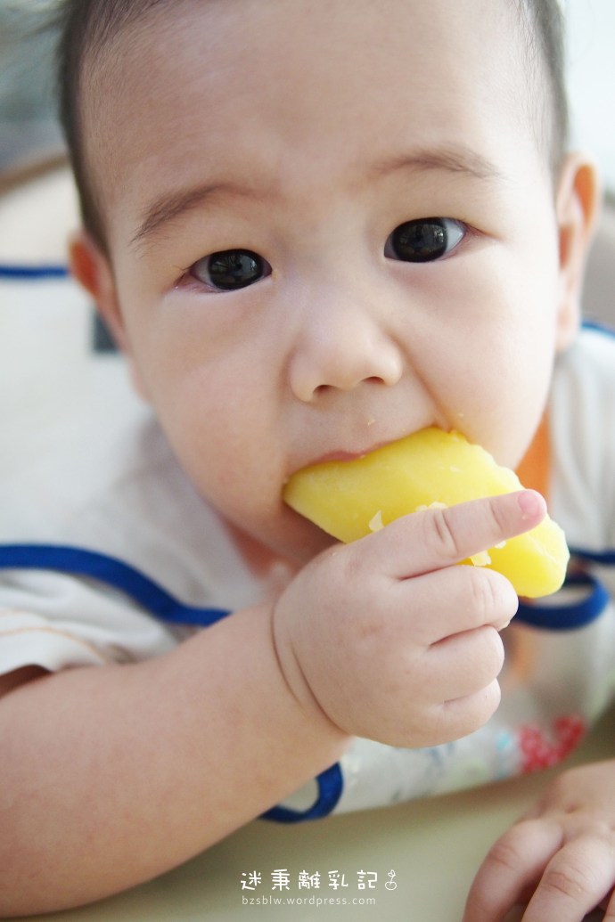 第一次給迷秉嘗試蔬菜類。蒸了半小條的去皮紅蘿蔔,是叉子剛好能刺穿過的程度,跟着興致勃勃給迷秉送去。「妳蒸得會不…
